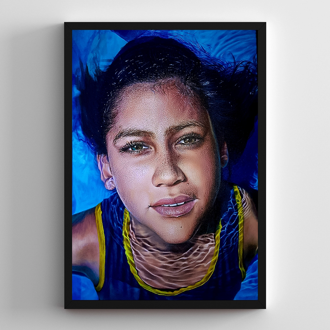“Emergence” is a photorealistic 59.4 × 84.1 cm acrylic portrait created using meticulous pointillism. The artwork captures a serene moment as the young subject rises from the water, her blue‑green eyes and delicate droplets rendered with exceptional detail and emotional depth.